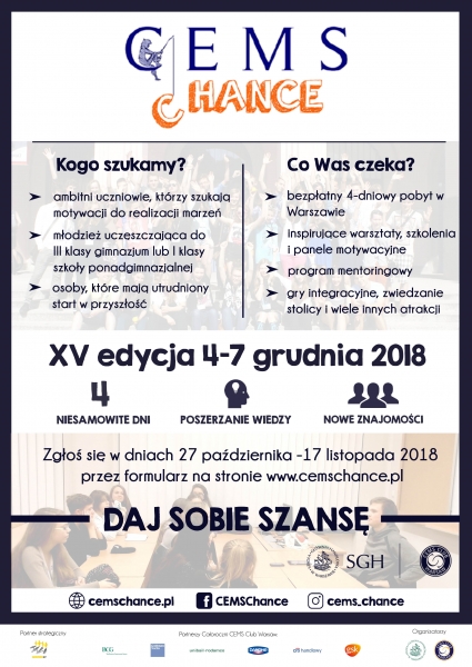 Zachęcamy uczniów klasy 3 gimnazjum oraz klas pierwszych liceum do zapoznania się z tą ciekawą propozycją CEMS Club Warszawa, organizacji non-profit działającej przy Szkole Głównej Handlowej w Warszawie.