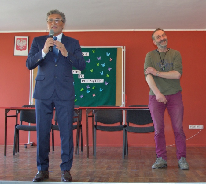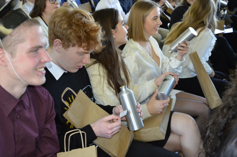 Uczniowie klas trzecich w zabawnym programie artystycznym przypomnieli starszym kolegom cztery trudne lata spędzone w szkole a na koniec wręczyli im drobny upominek w postaci bidonu z logo Liceum.